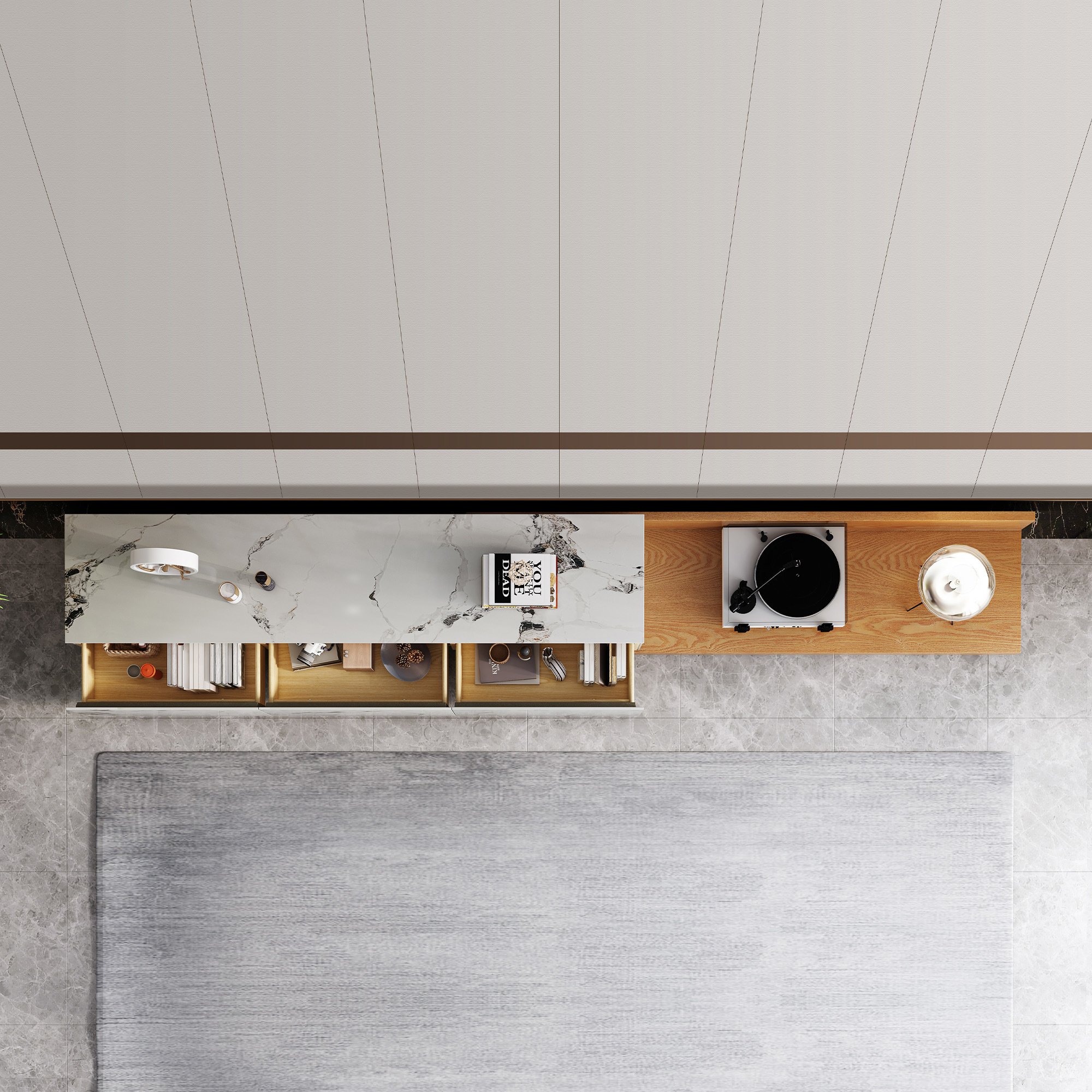 Italian style minimalist faux marble TV stand, with a minimalist look and clean lines, this TV stand comes with two separate projects, consisting of a multi-layer solid wood cabinet with a fully veneered sintered top and a retractable wood shelf. In addition, the natural wood grain of the retractable wood shelf adds a rustic look to this modern industrial booth and complements the luxurious, lightweight décor.