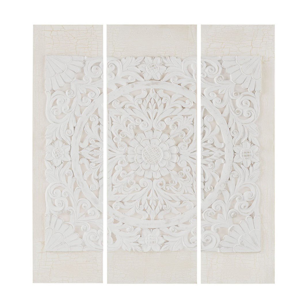 Hang our Madison Park Mandala Triptych 3-piece Dimensional Resin Canvas Wall Art Set on your wall to create a unique focal point in your space. An intricate carving design with the look and feel of wood is made from durable resin, then attached to the embellished canvas and set among each piece of this 3PC wall decor. The embellished canvas is featured in an off white washed tone and purposefully distressed, adding a rustic charm to the look. Globally inspired, this alternative wall decor adds a stunning texture and unique boho touch to any room in your home.