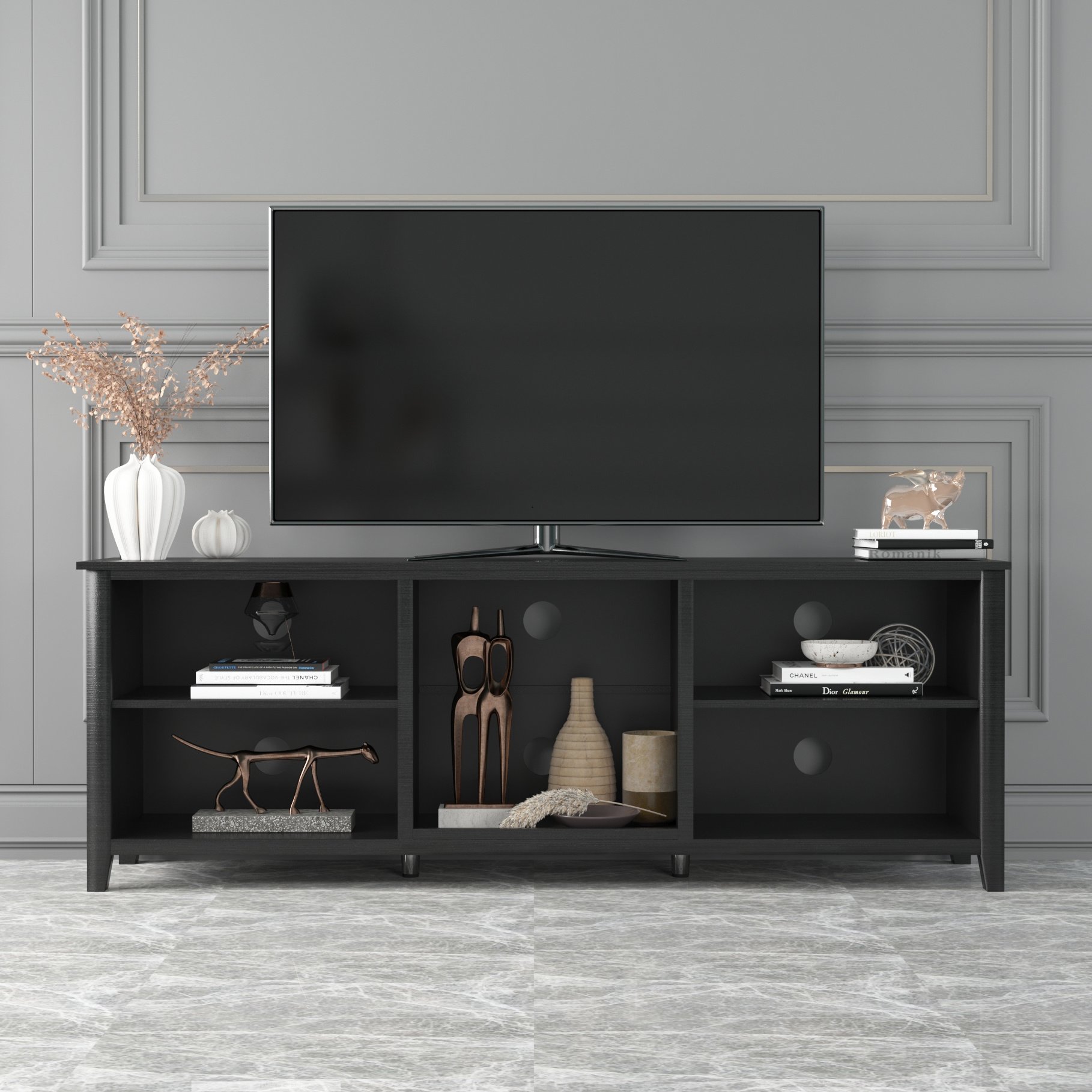 [Ample Display and Storage Space] TV stand the spacious 70.08 inch long 15.35 inch wide tabletop can accommodate TV within 60 inches, 5 open storage compartments cabinet for TV box, game console, remote controls, or anything you like. Top panel supports up to 200 lbs and shelf supports 40 Ibs.
